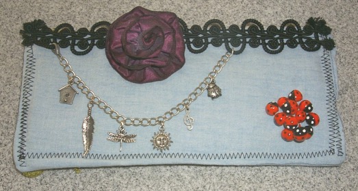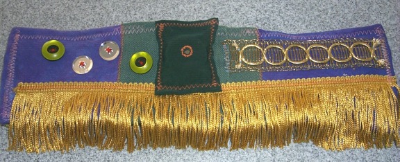 And here's my other toy, with buttons, decorative trim, and tassle trim along the bottom. I've been good and not pulled at any of the individual tassle strings too hard (I prefer to pry between them), but my mom checks it daily to make sure it's intact. My favorite thing on this toy is the hole in the green panel in the middle: there's a button under there that makes a sound if I press it hard enough! (Hear the sound)
